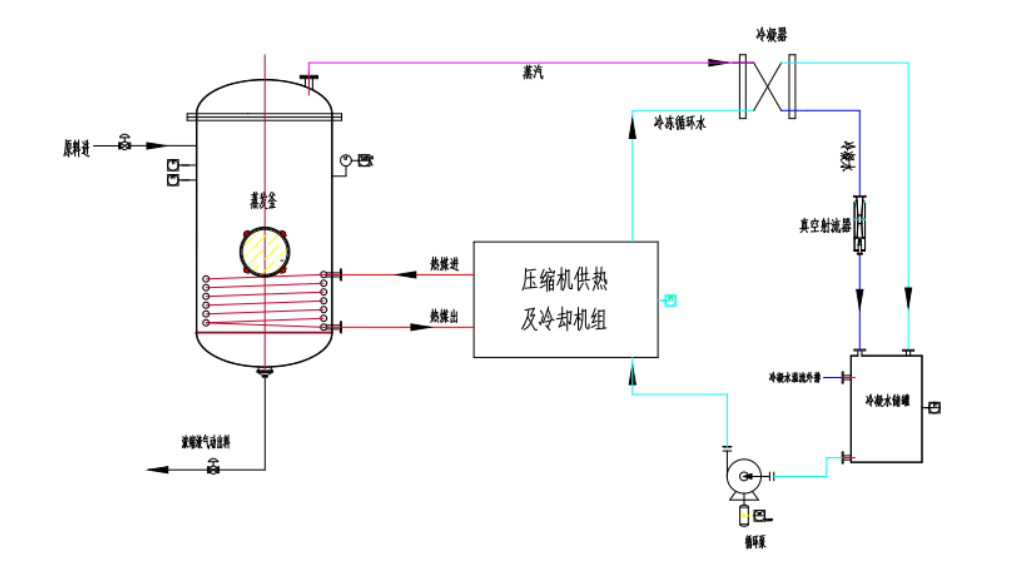 ▲蒸汽走向:蒸汽走向:冷媒壓縮后給物料加熱,蒸發(fā)出來二次蒸汽進(jìn)入冷凝器與減壓后的冷媒換熱冷凝,冷凝水進(jìn)入冷凝水儲(chǔ)罐。