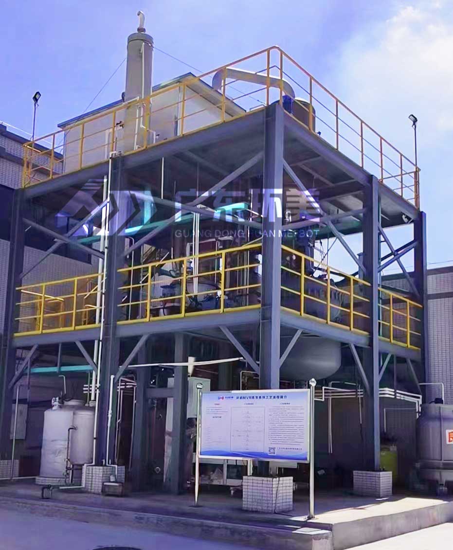 MVR蒸發(fā)器采用壓縮機(jī)提高二次蒸汽的能量,并對(duì)提高能量的二次蒸汽加以利用,回收二次蒸汽的潛熱。具體為:將蒸發(fā)器產(chǎn)生的二次蒸汽,通過(guò)壓縮機(jī)的絕熱壓縮,使其壓力、溫度提高后,再作為加熱蒸汽送入蒸發(fā)器的加熱室,冷凝放熱,因此蒸汽的潛熱得到了回收利用。